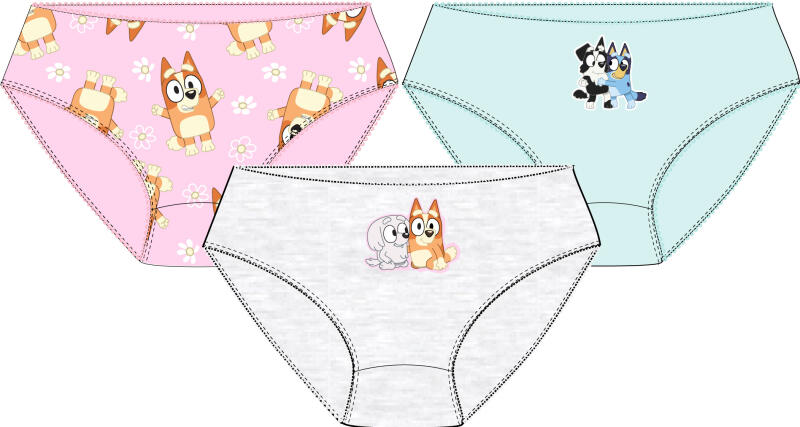 Lány alsónemű - Bluey mix 3 db A kényelmes ruházat mellett a lányoknak jó minőségű, légáteresztő anyagból készült alsóneműre is szükségük van. Válasszon Bluey mintás alsónemű t , hogy gyermeke jól érezze magát.